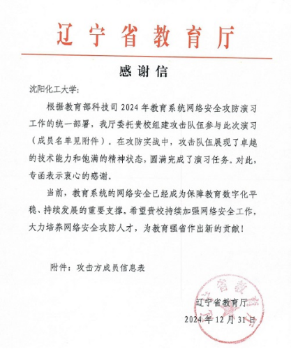 在教育部科技司组织的2024年教育系统网络安全攻防演习中,我校beat365英国官方网站院长王军教授网络安全团队受辽宁省教育厅委托参加此次演习。在攻防实战中,团队展现了卓越的技术能力和饱满的精神状态,圆满完成了演习任务,并收到了辽宁省教育厅的感谢信。