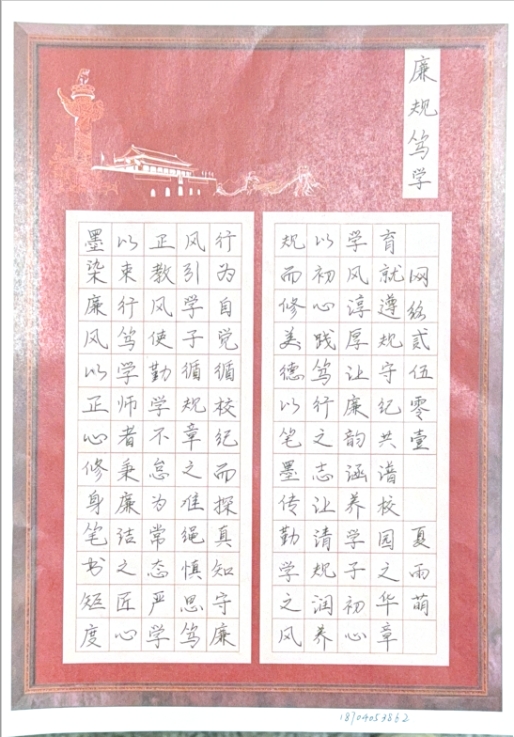 本次大赛自启动以来,得到全院师生积极响应,共征集到软笔、硬笔书法作品四十余幅。作品紧扣廉洁文化、教风与学风建设核心主题,涵盖名人名言、诗词警句、原创文稿等多元形式,既彰显扎实书法功底,更传递“崇廉尚洁、遵规守纪、笃学实干”的价值追求。